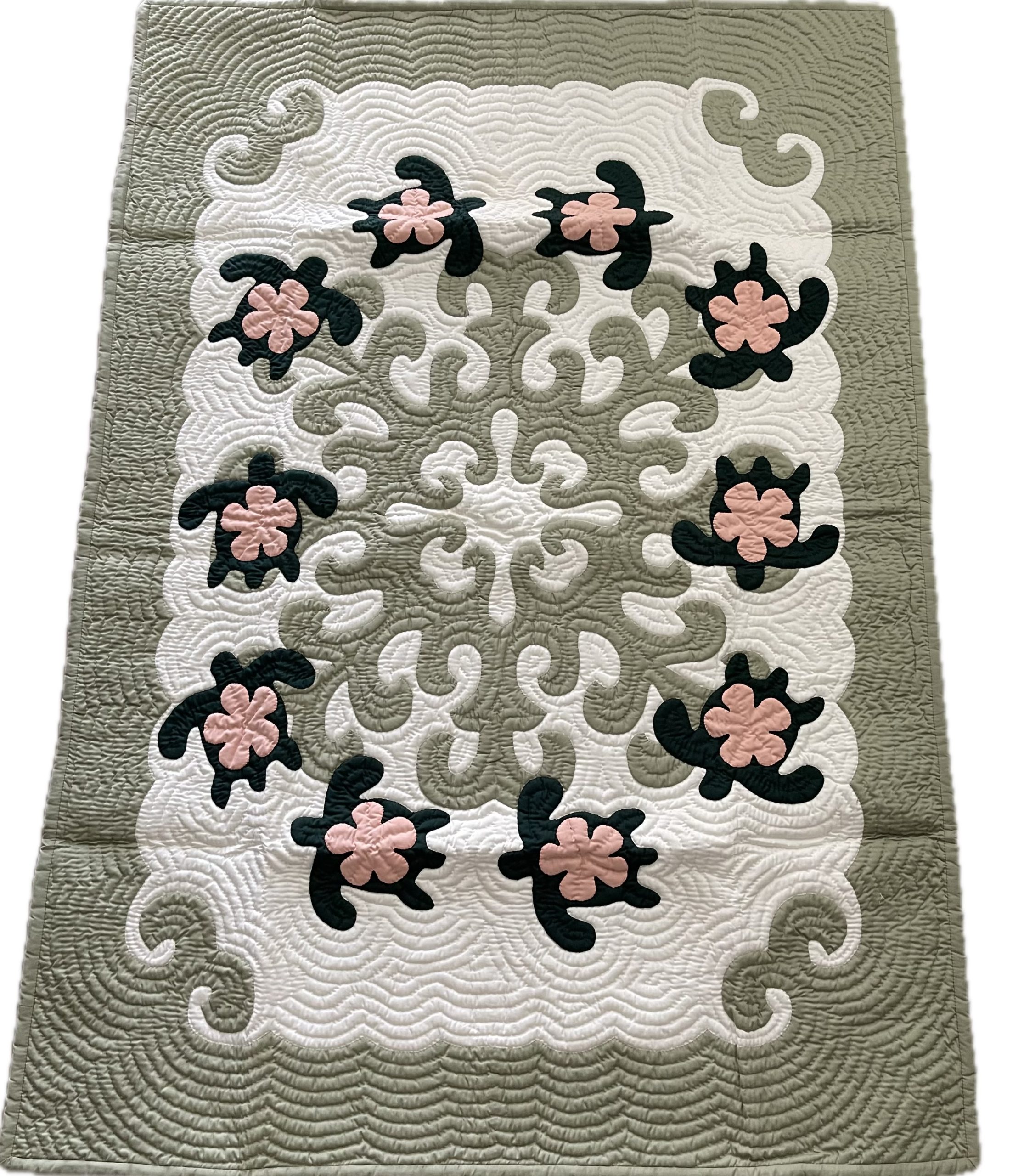 We employ the world-renowned Hawaiian quilting stitch/applique method. This lap blanket/wall hanging is constructed of 100% cotton using superior materials. We discovered that this combination provided the highest durability and texture. We hand-washed our quilts three times to guarantee their material integrity. This is a fresh new wall hanging that has been completely hand quilted and applied, rather than machine embroidered. It features fabric hangers in the rear for convenient hanging. Bring some Hawaiian style into your house or office. It can also be attractively framed. Our quilts are a great discussion piece/centerpiece in any home or business, and they also make excellent gifts for any special occasion!