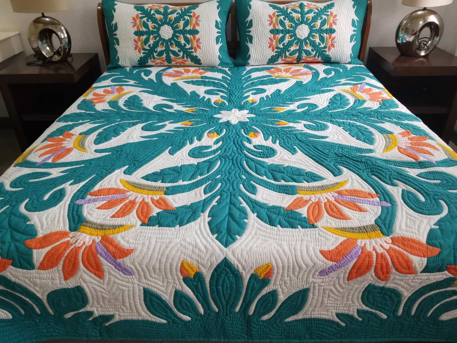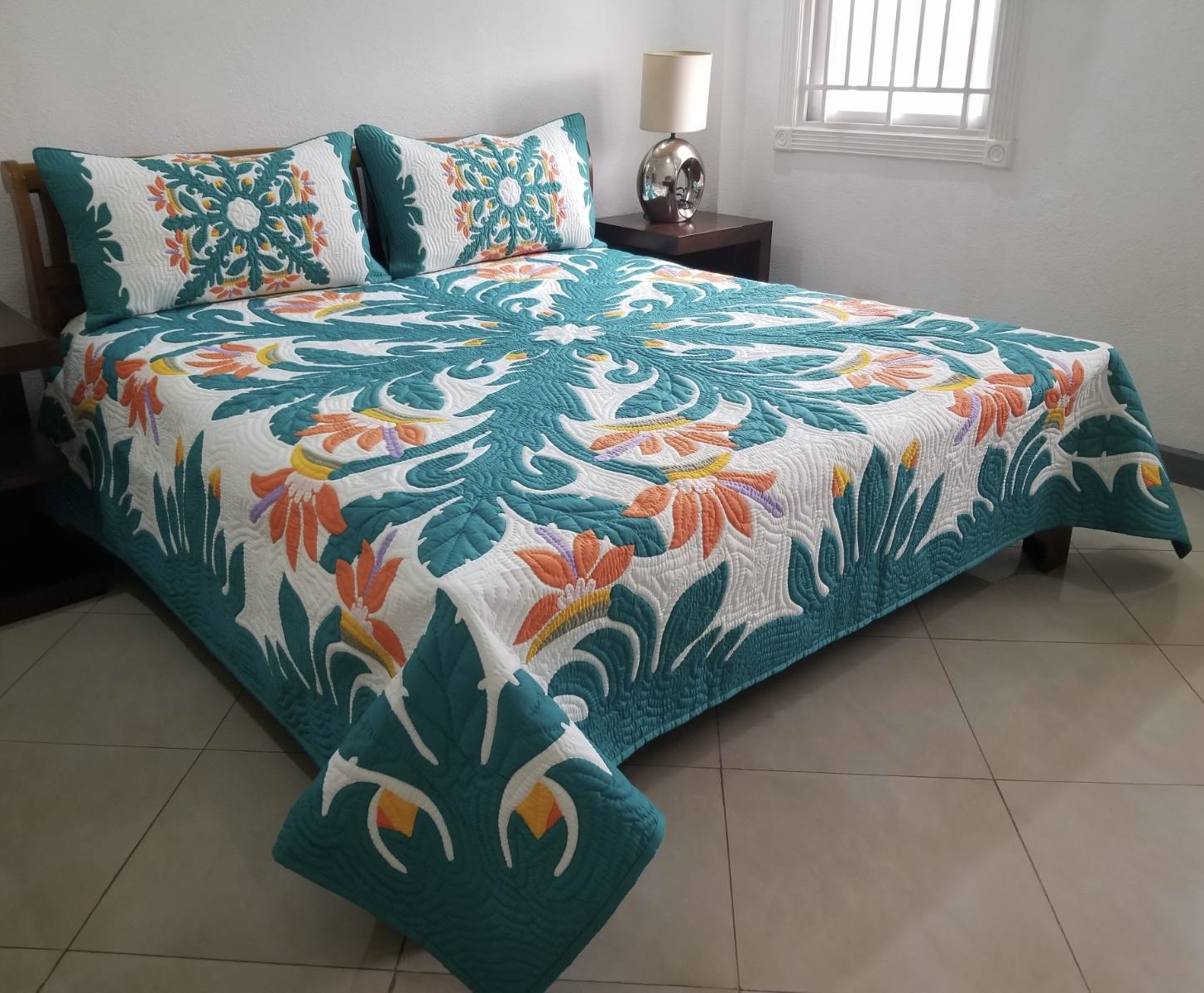 We employ the renowned traditional Hawaiian quilting design and appliqué technique.This is a brand new, entirely HAND QUILTED and HAND APPLIQUÉD bedspread, not machine embroidered. It is suitable for a King or Queen size bed and includes two coordinating pillow shams. Incorporate a touch of Hawaiian elegance and infuse Aloha into your residence. Our quilts serve as an excellent conversation piece or focal point within any residence, and they also make a wonderful gift for any special occasion.
