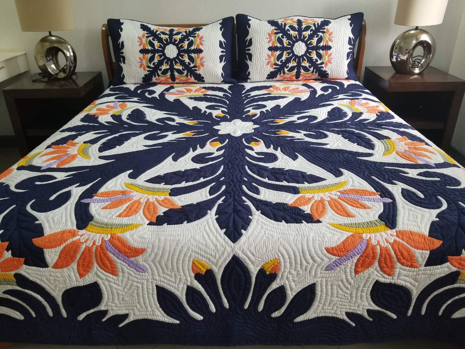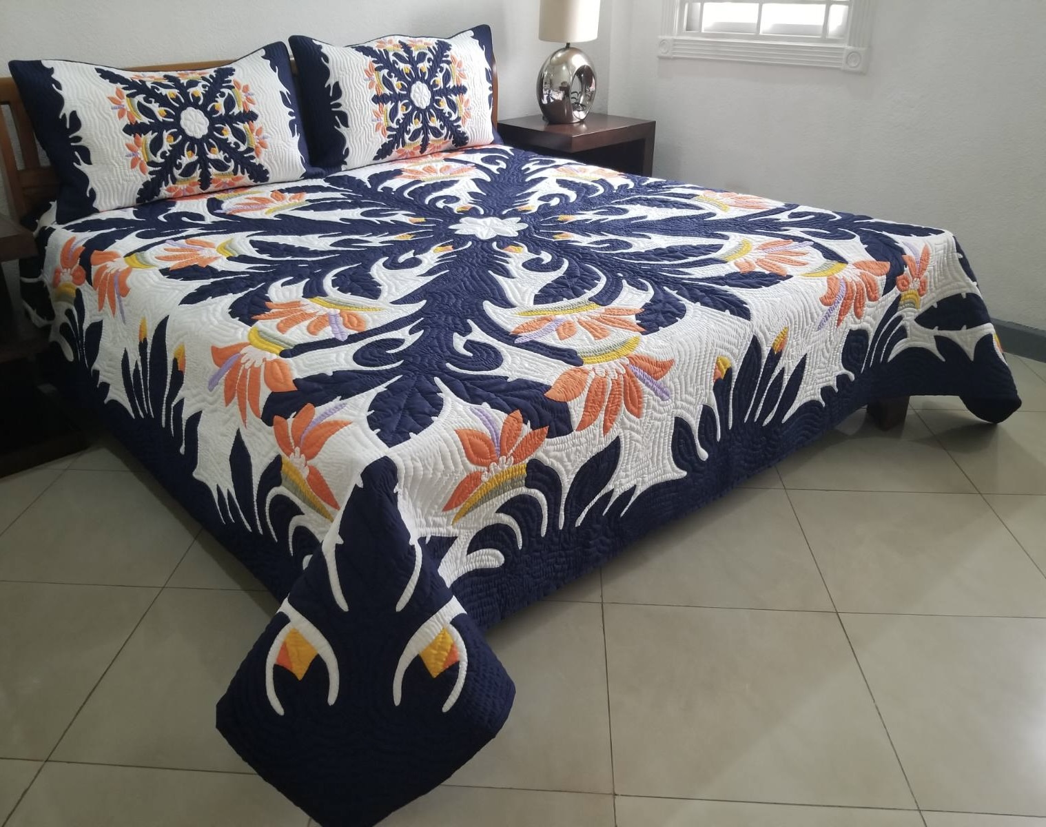 This bedspread has recently been completed, along with two matching pillow shams. Quilting is receiving much attention and dedication. This bedspread is quite remarkable. Each bedspread is unique, since we produce just one piece for every color and design. We attentively craft these bedspreads to ensure optimal quality for our consumers. This is a different design option of our Birds of Paradise bedspread.