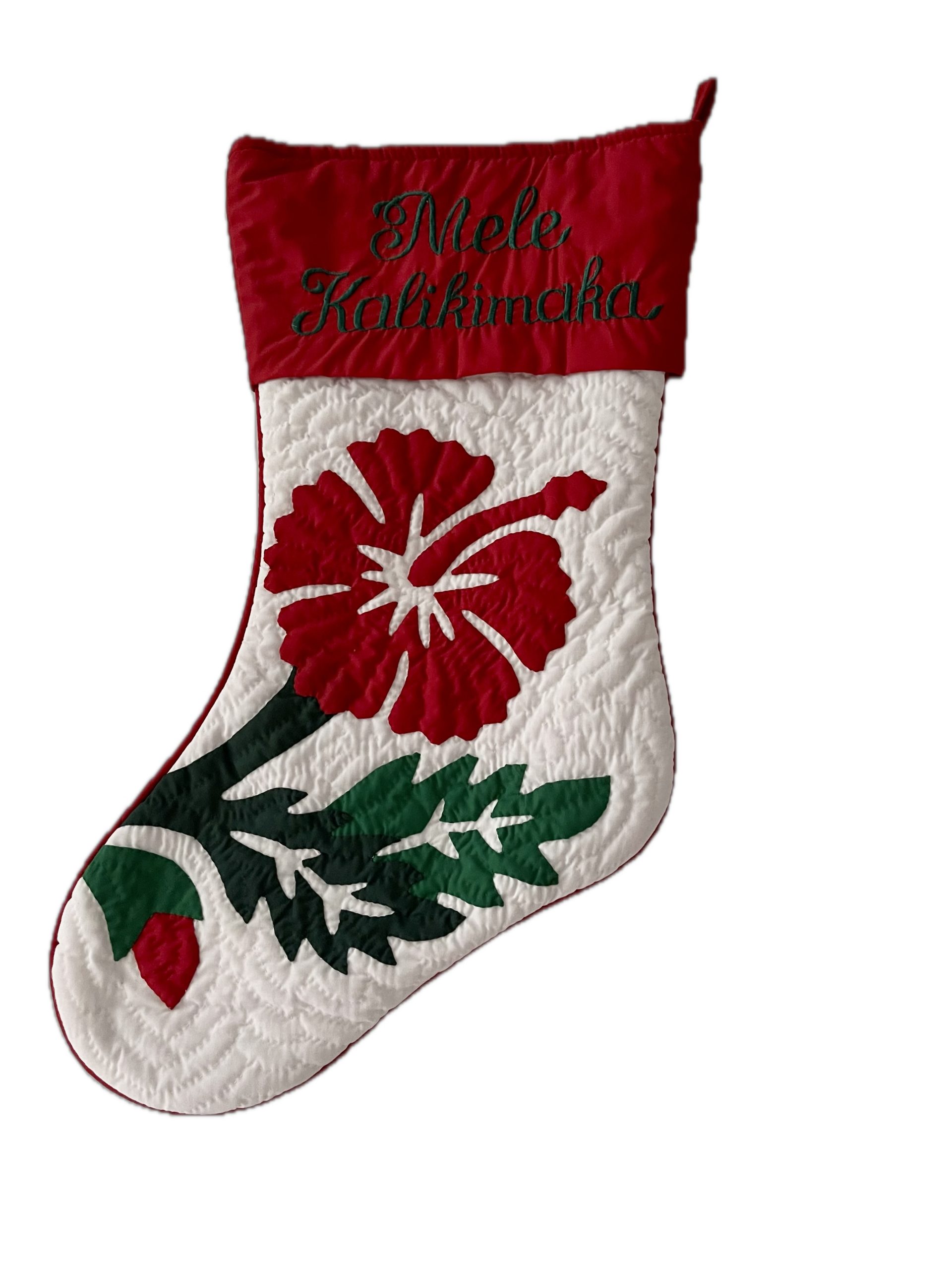 A fabric loop and the words “Mele Kalikimaka” are embroidered over the cuff of this brand-new,  HAND QUILTED and HAND APPLIQUÉD Christmas stocking. Bring some Hawaiian flair and positive energy into your house or place of business.