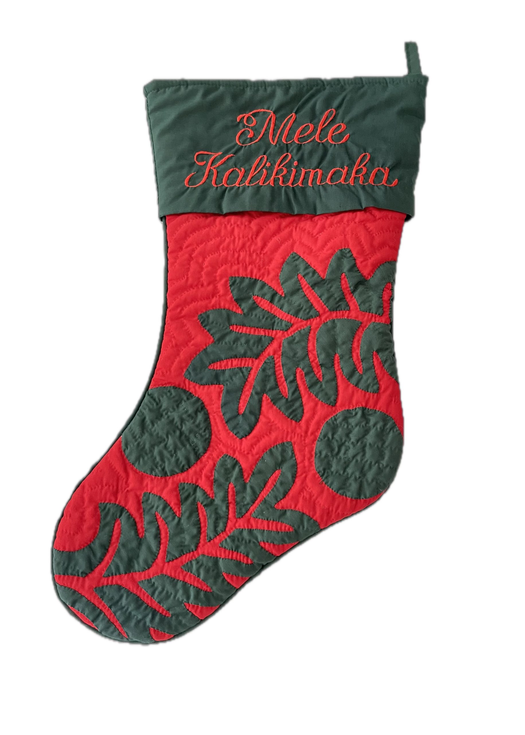 A fabric loop and the words “Mele Kalikimaka” are embroidered over the cuff of this brand-new, HAND QUILTED and HAND APPLIQUÉD Christmas stocking. Bring some Hawaiian flair and positive energy into your house or place of business.