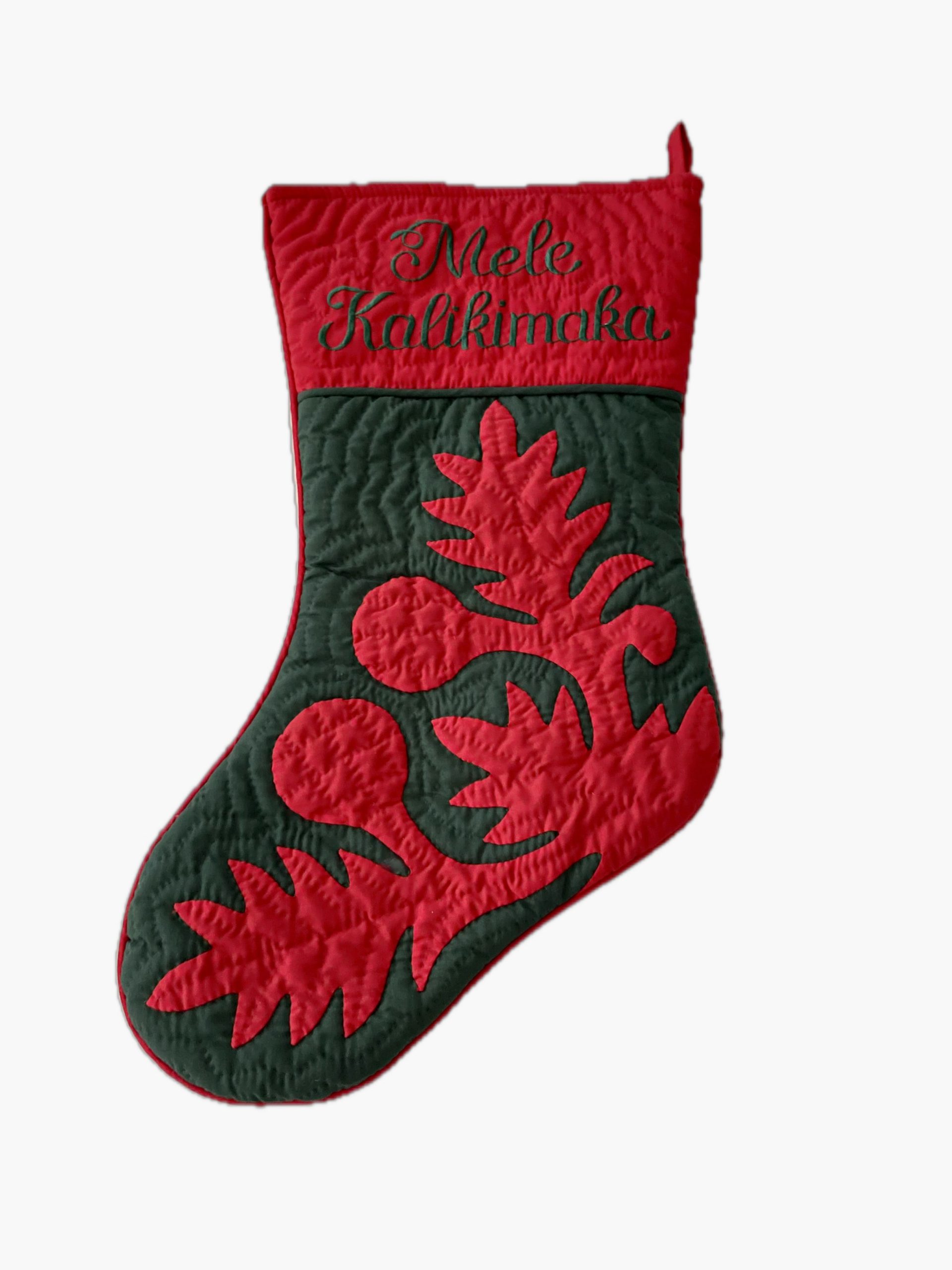 A fabric loop and the words “Mele Kalikimaka” are embroidered over the cuff of this brand-new,  HAND QUILTED and HAND APPLIQUÉD Christmas stocking. Bring some Hawaiian flair and positive energy into your house or place of business.