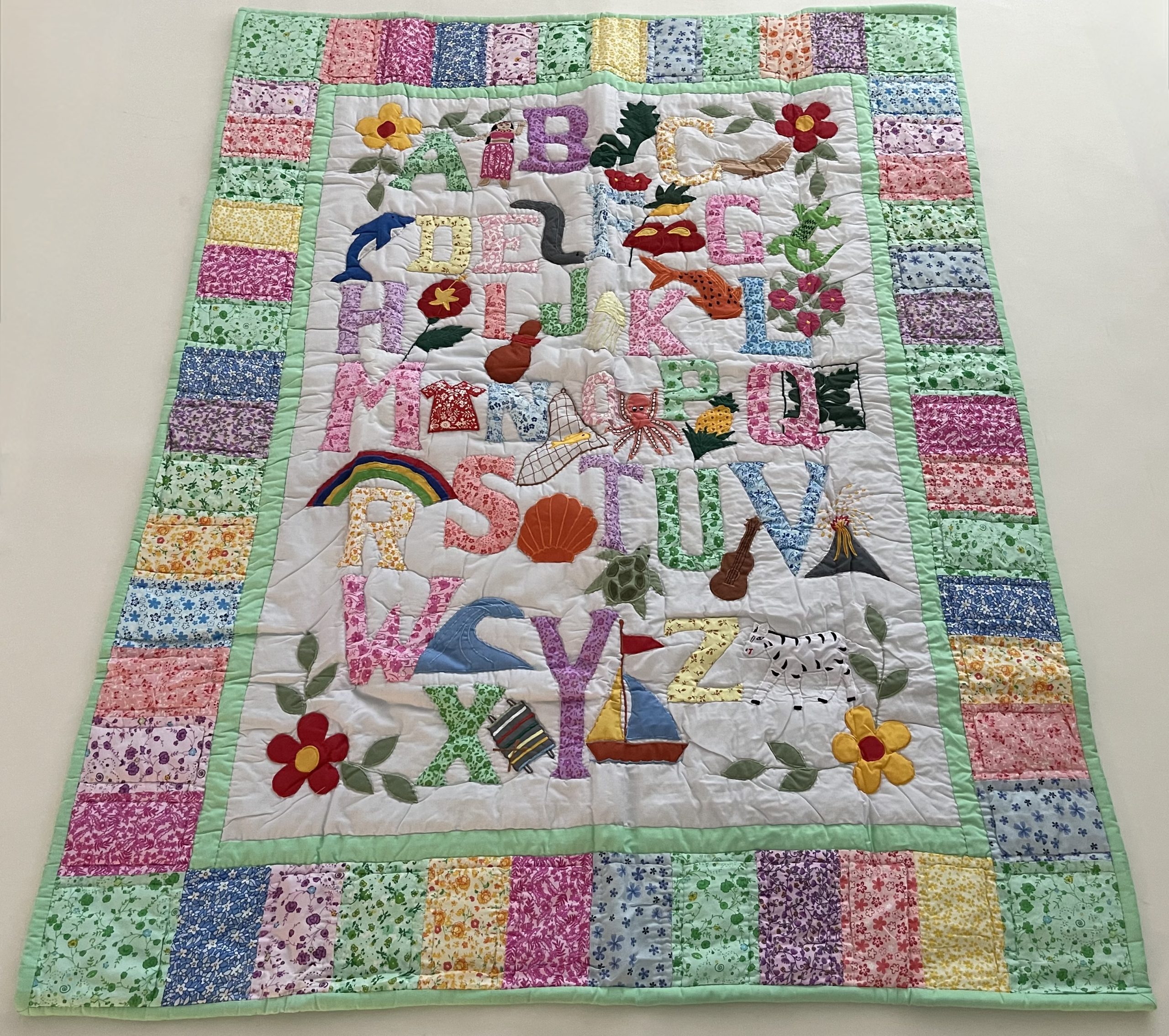This is a brand new baby quilt/blanket, well constructed by hand stitched and machine embroidered. This baby quilt can be used as crib blanket as well as wall hanging. It has cloth hangers in the back for easy hanging. It can also be framed beautifully. It makes a terrific gift for Christmas, birthday and baby shower.