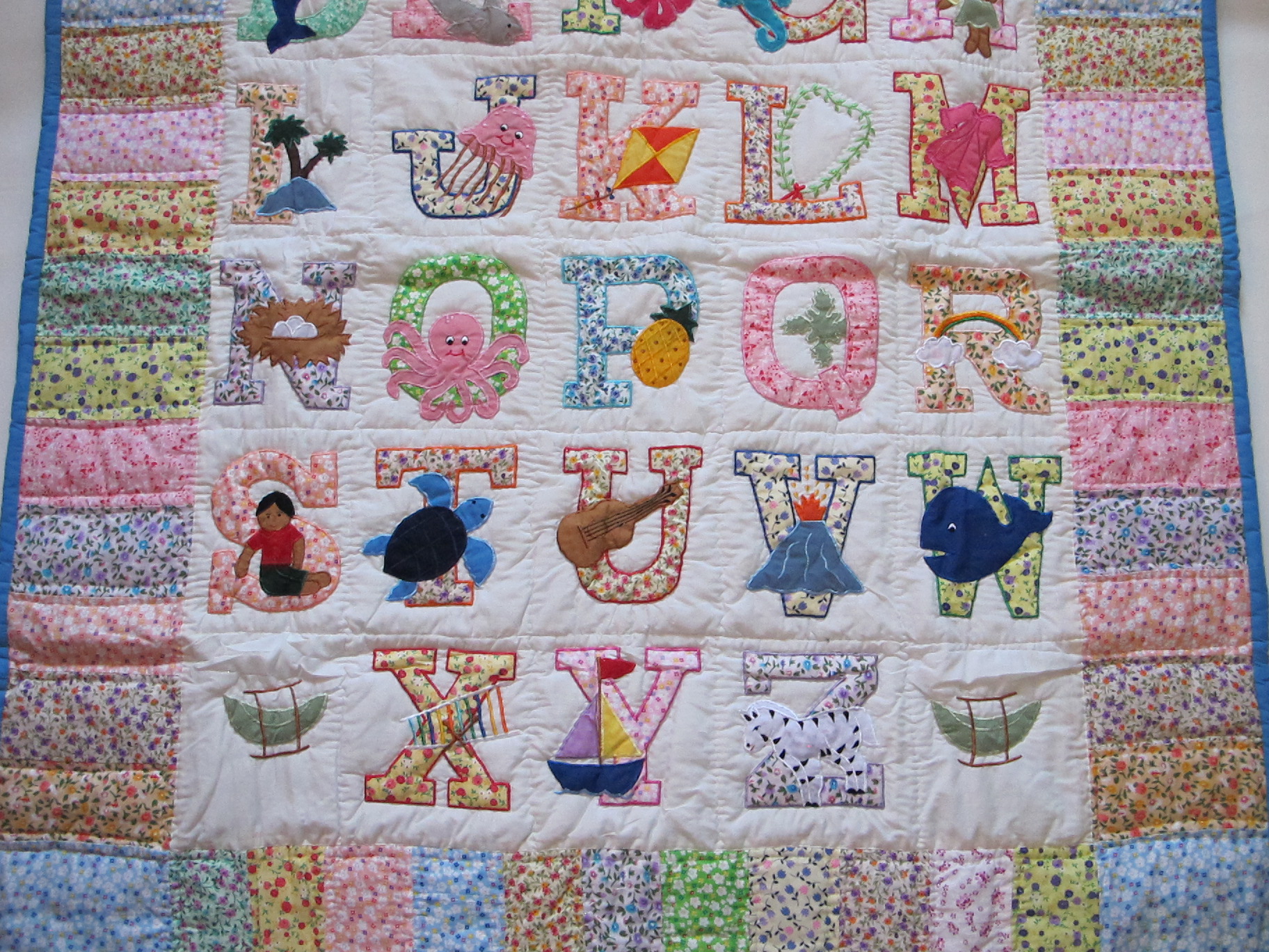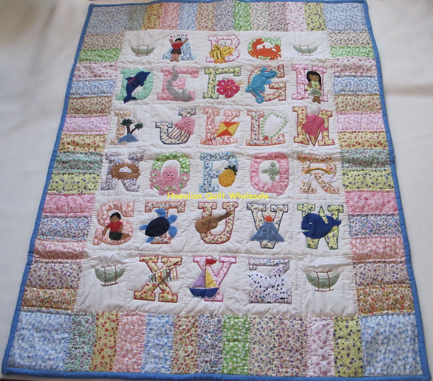 This brand-new baby quilt/wall hanging is expertly made with hand stitching on the border and machine embroidery. For simple hanging, it features fabric hangers in the back. This baby quilt can be hung on the wall or used as a crib blanket. Bring some Aloha into your baby’s room by adding some Hawaiian design. It’s a wonderful present for occasions like birthdays, Christmas, christenings, etc.