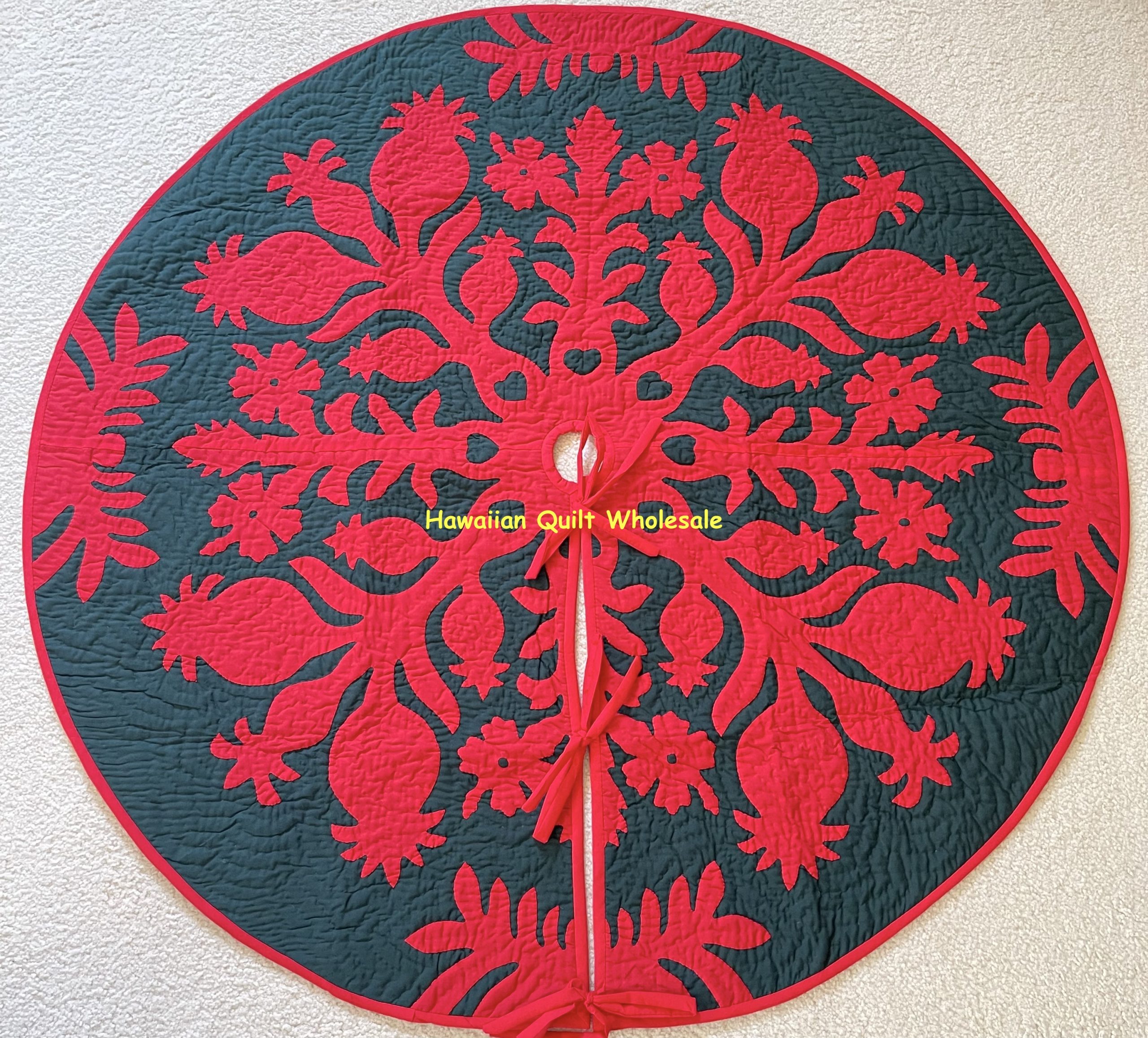 This is a brand new, 100% HAND QUILTED and HAND APPLIQUED Christmas tree skirt. It looks great under the Christmas tree and it has bow tie strings for easy closure. Add some Hawaiian style and bring Aloha to your home or office. Our quilts makes a great conversation/centerpiece to any home and also it makes a terrific gift for any special occasion! It can also framed beautifully.