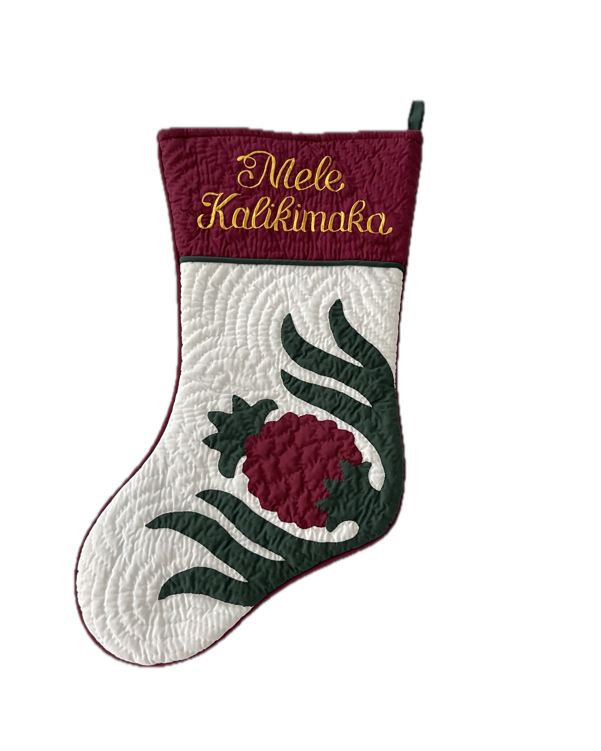 A fabric loop and the words “Mele Kalikimaka” are embroidered over the cuff of this brand-new,  HAND QUILTED and HAND APPLIQUÉD Christmas stocking. Bring some Hawaiian flair and positive energy into your house or place of business.