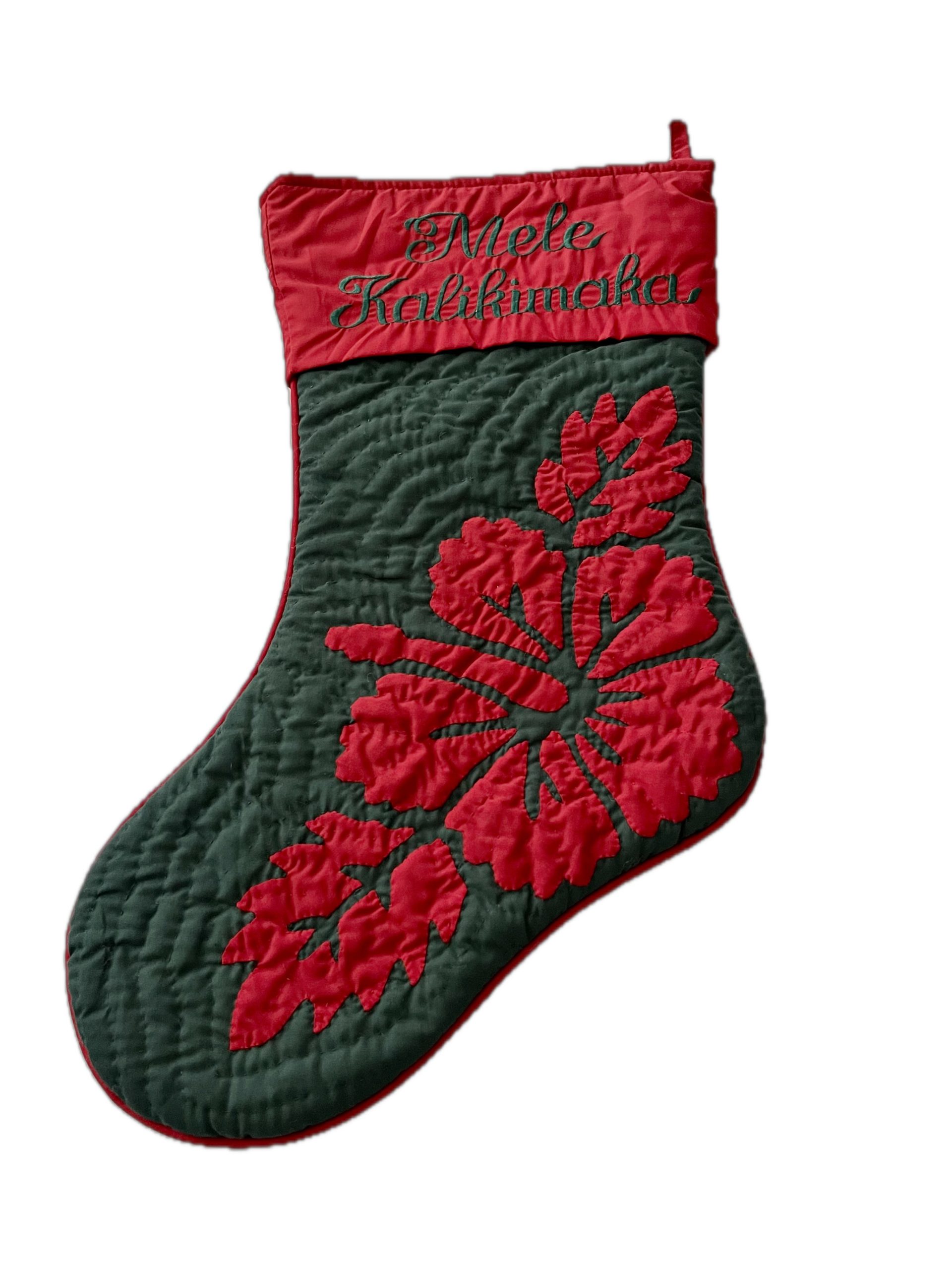 A fabric loop and the words “Mele Kalikimaka” are embroidered over the cuff of this brand-new, HAND QUILTED and HAND APPLIQUÉD Christmas stocking. Bring some Hawaiian flair and positive energy into your house or place of business.