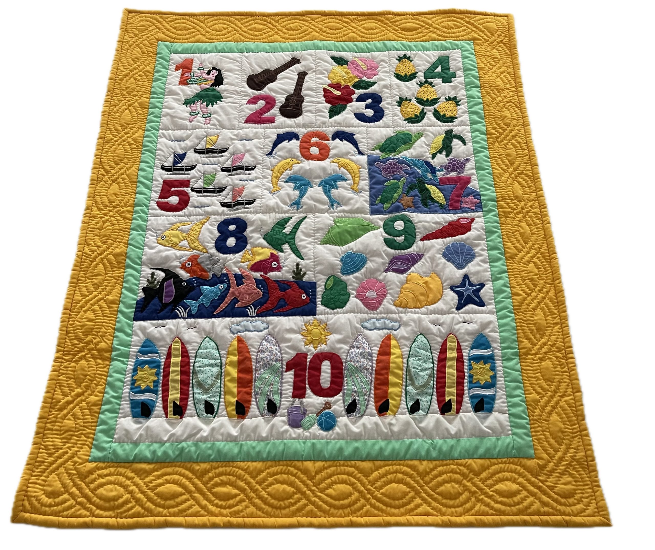 This is a brand new baby quilt/blanket, well constructed by hand stitched and machine embroidered. This baby quilt can be used as crib blanket as well as wall hanging. It has cloth hangers in the back for easy hanging. It can also be framed beautifully. It makes a terrific gift for Christmas, birthday and baby shower. Add some Hawaiian style and bring Aloha to your baby’s room.