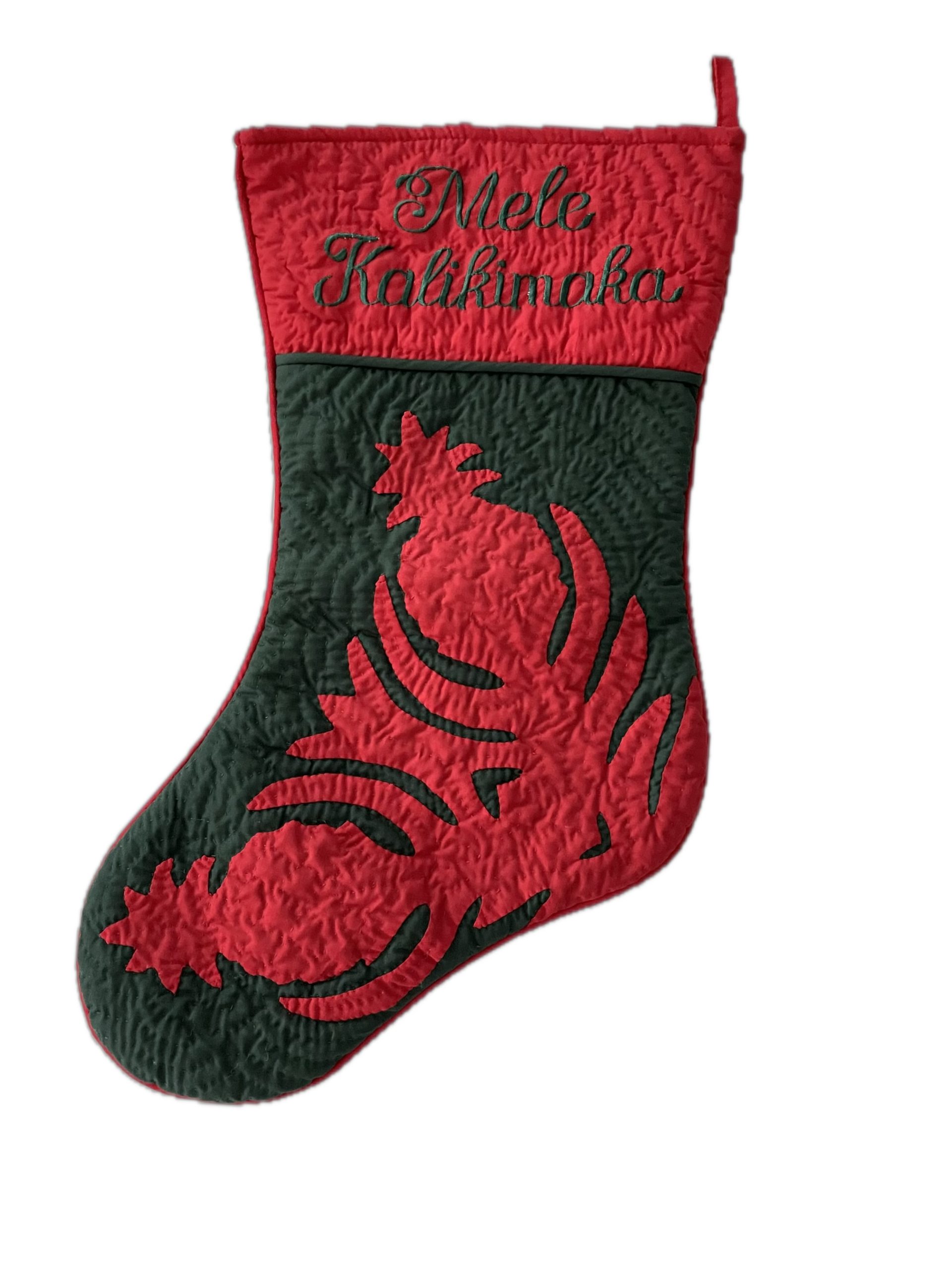 A fabric loop and the words “Mele Kalikimaka” are embroidered over the cuff of this brand-new, HAND QUILTED and HAND APPLIQUÉD Christmas stocking. Bring some Hawaiian flair and positive energy into your house or place of business.