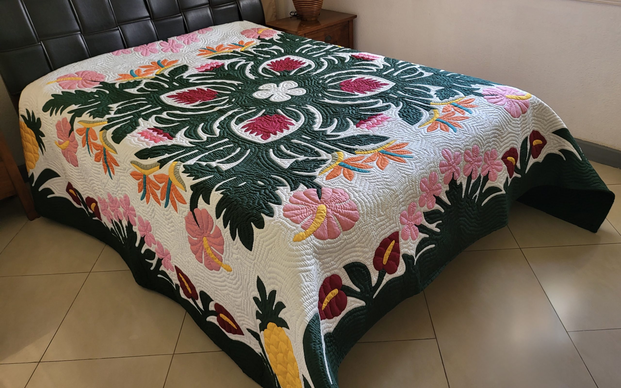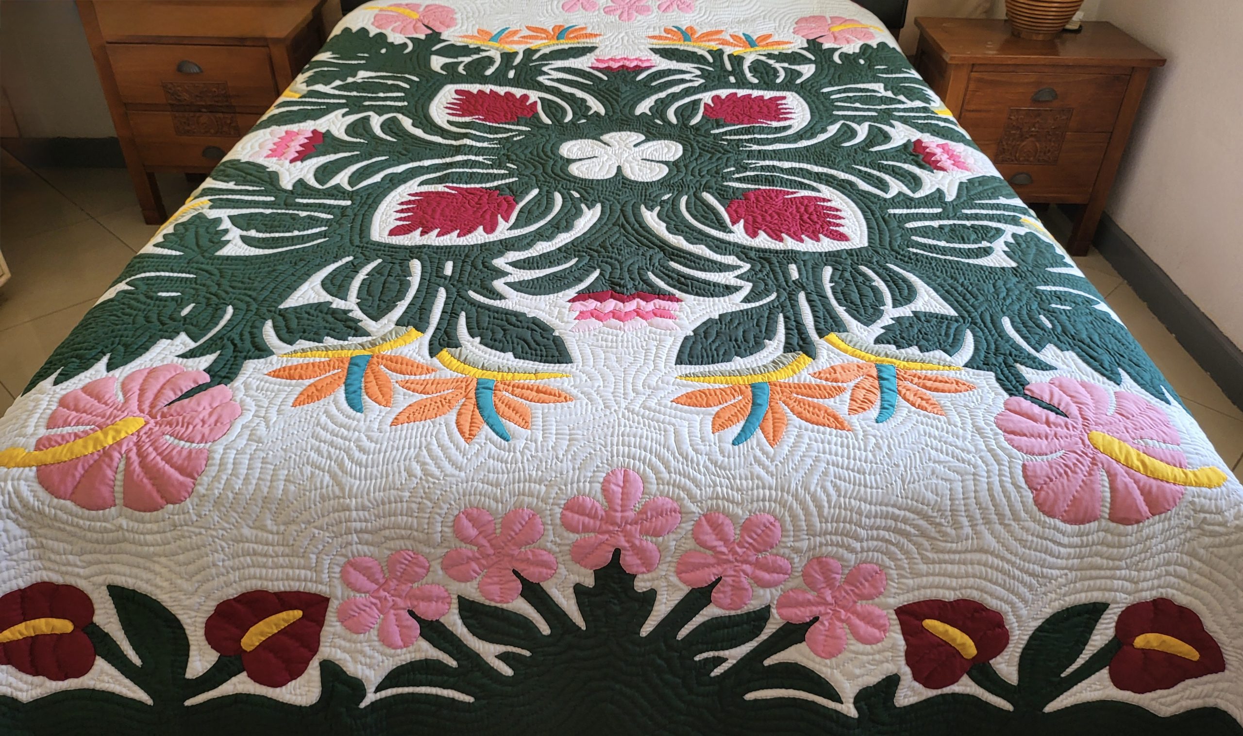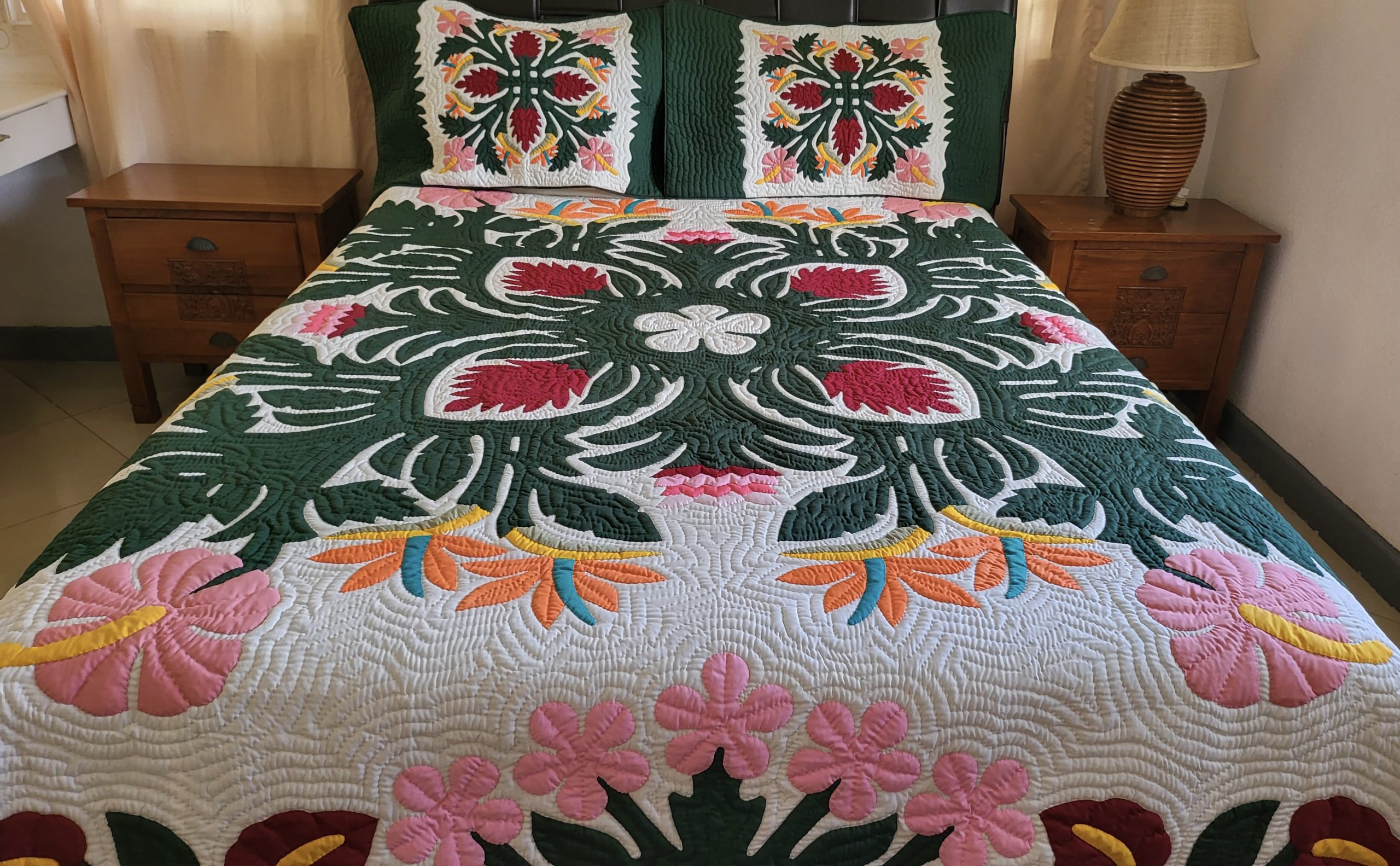 We employ the renowned traditional Hawaiian quilting design and appliqué technique.This is a brand new, entirely HAND QUILTED and HAND APPLIQUÉD bedspread, not machine embroidered. It is suitable for a King or Queen size bed and includes two coordinating pillow shams. Incorporate a touch of Hawaiian elegance and infuse Aloha into your residence. Our quilts serve as an excellent conversation piece or focal point within any residence, and they also make a wonderful gift for any special occasion.