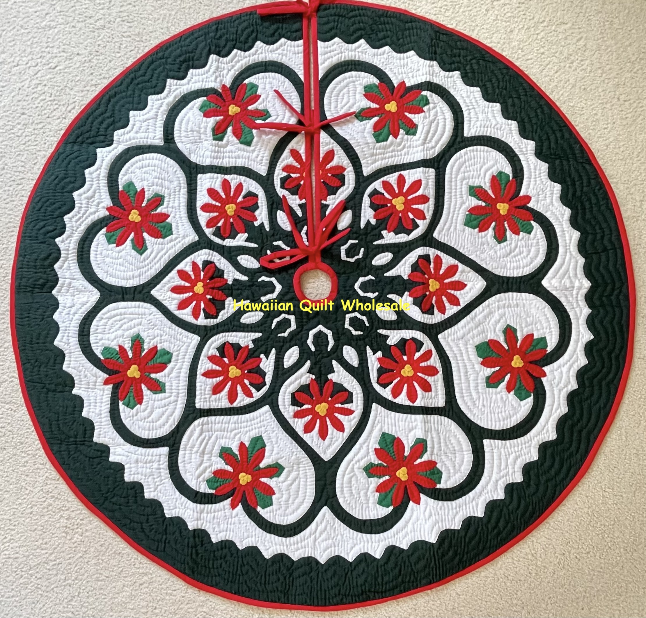 This is a brand new, 100% HAND QUILTED and HAND APPLIQUED Christmas tree skirt. It looks great under the Christmas tree and it has bow tie strings for easy closure. Add some Hawaiian style and bring Aloha to your home or office. Our quilts makes a great conversation/centerpiece to any home and also it makes a terrific gift for any special occasion! It can also framed beautifully.