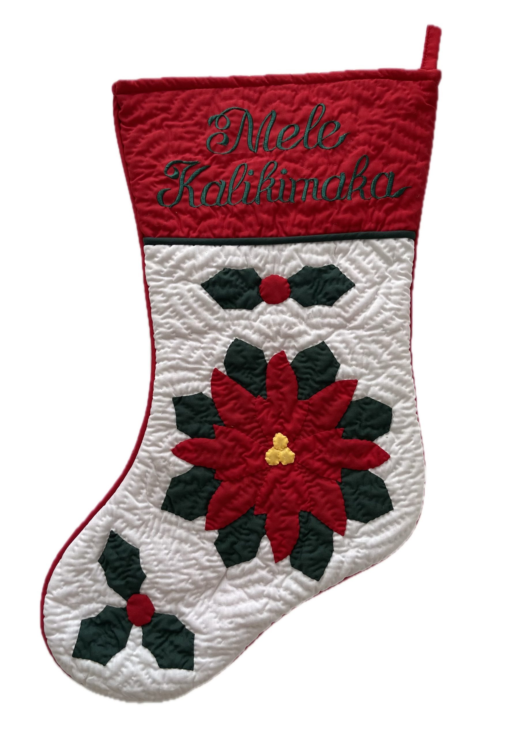 A fabric loop and the words “Mele Kalikimaka” are embroidered over the cuff of this brand-new, HAND QUILTED and HAND APPLIQUÉD Christmas stocking. Bring some Hawaiian flair and positive energy into your house or place of business.