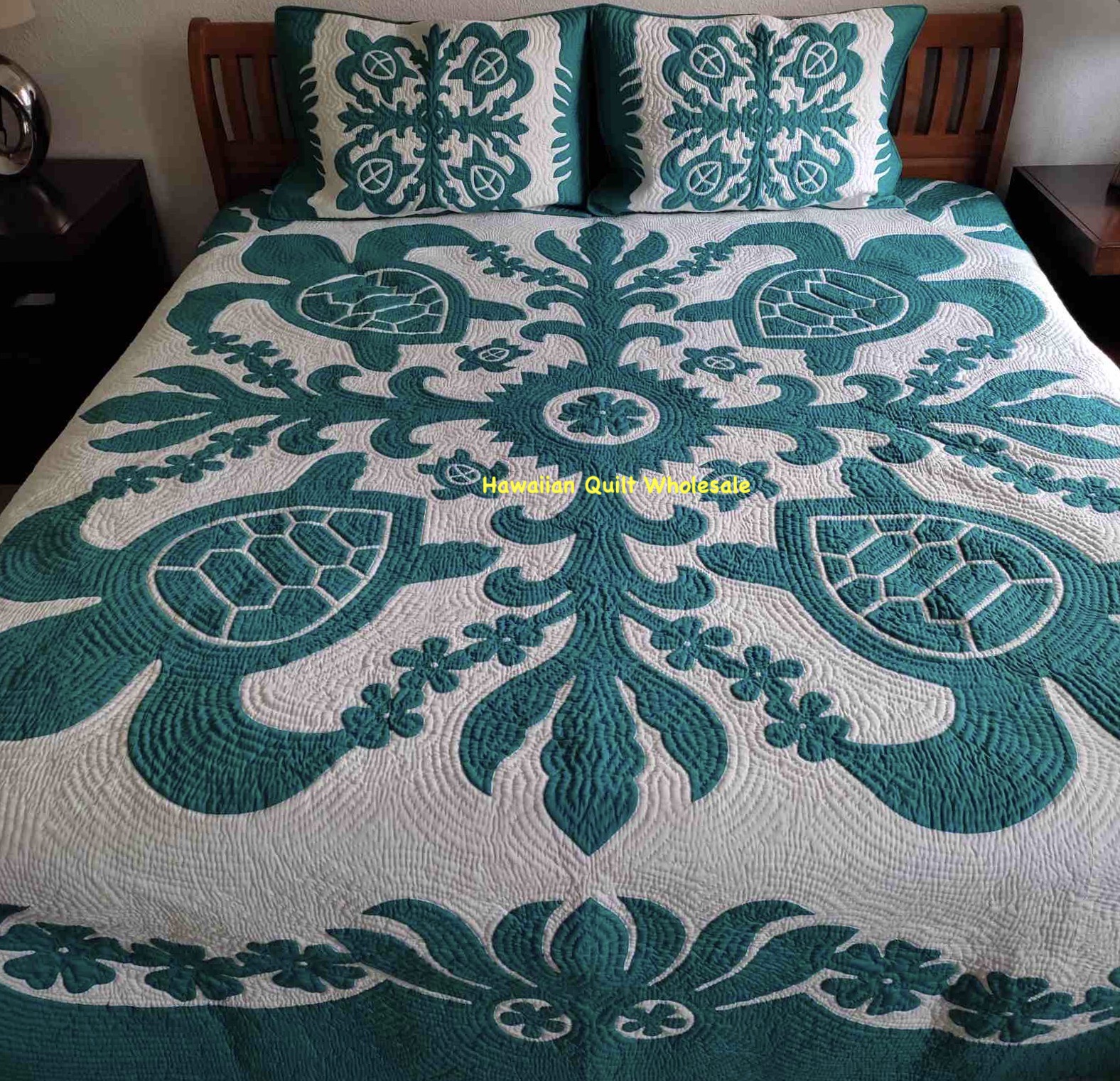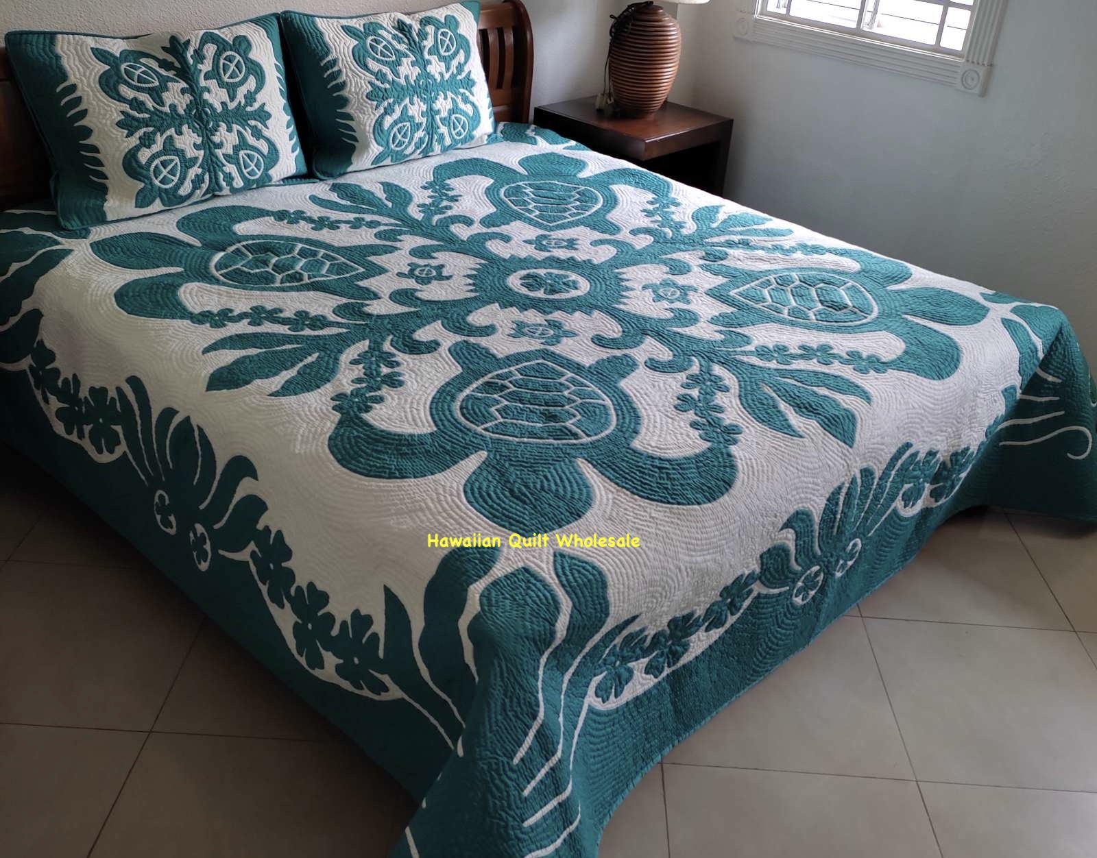 This bedspread set is made of 100% cotton using superior materials. We found this combination to be the best for durability and texture. We hand washed our quilts three times to ensure material integrity. We use the traditional world famous Hawaiian quilting stitch/appliqué method. This is a brand new, 100% HAND QUILTED and HAND APPLIQUÉD, NOT MACHINE EMBROIDERED bedspread. It fits on a King or Queen size beds with two matching pillow shams. Add some Hawaiian style and bring Aloha to your home. Our quilts makes a great conversation/centerpiece to any home and also it makes a terrific gift for any special occasion!