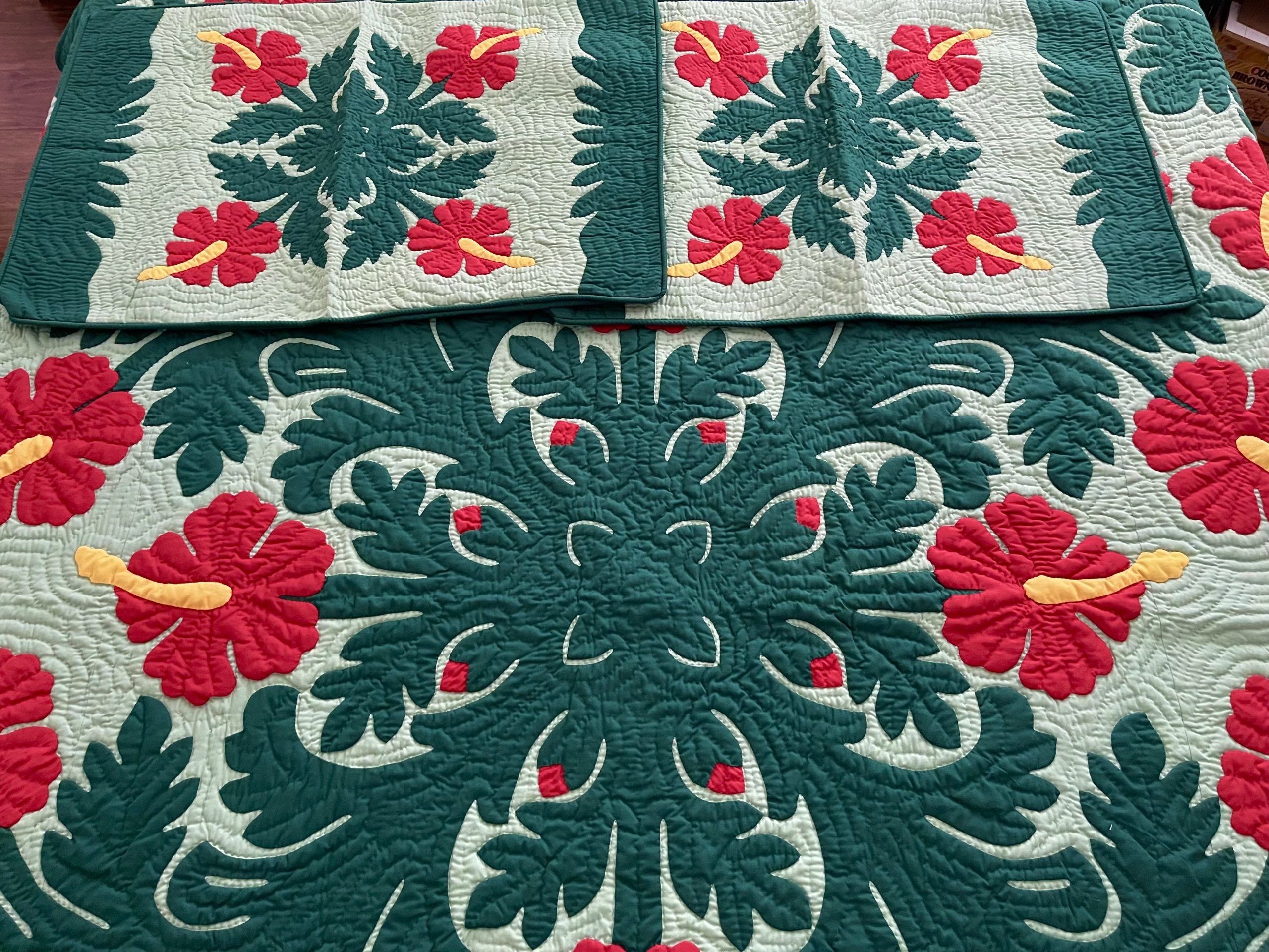 We employ the time-honored, renowned Hawaiian quilting stitch/appliqué technique. This is a brand-new, completely HAND QUILTED and HAND APPLIQUÉD bedspread that is NOT MACHINE EMBROIDERED. It is versatile enough to be used as a bed cover, wall hanging, or lap blanket for full and twin size beds. Cloth hangers are sewn to the back of the bedspread to allow for convenient hanging. Bring some Hawaiian flair and Aloha into your house. Our quilts are wonderful discussion pieces for any house and wonderful presents for any special occasion!