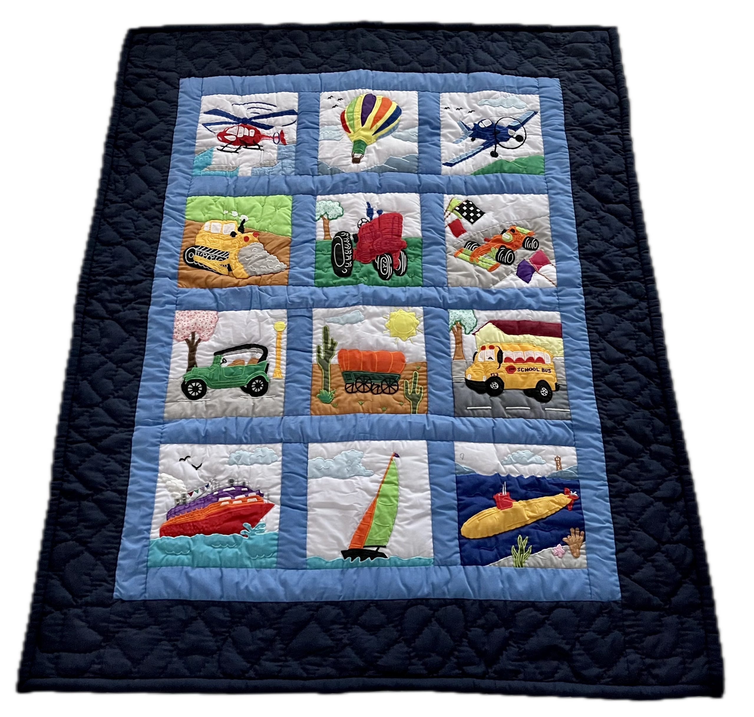 This is a brand new baby quilt or blanket that has been hand sewn and machine embroidered.